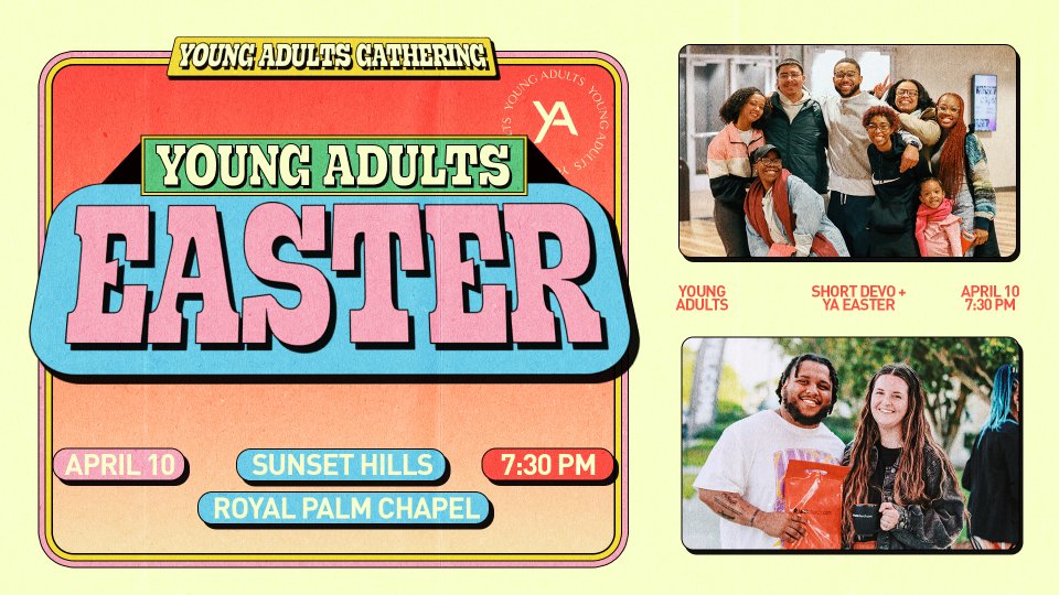 Hey, Young Adults (18-35). Why should kids have all the fun? It’s time to channel your inner child. Join us for the ultimate Adult Easter Egg Hunt - Thursday, April 10th, 7:30-9:00 PM, at Sunset Hills. We’ll start with a short devotional… to keep us grounded. Then on to the egg hunt, a friendly egg-stuffing competition, and of course, epic snacks! (Enjoy much better prizes and no toddlers stealing your eggs.) Bring your best game, your best friends, and your best skills. Don’t miss out! See you there!