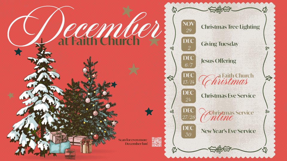 December at Faith Church is where the season comes alive! From twinkling lights and powerful moments of worship to giving back and celebrating together, every weekend is packed with something special you won’t want to miss. There’s no better time to bring your family and friends and be part of it all!