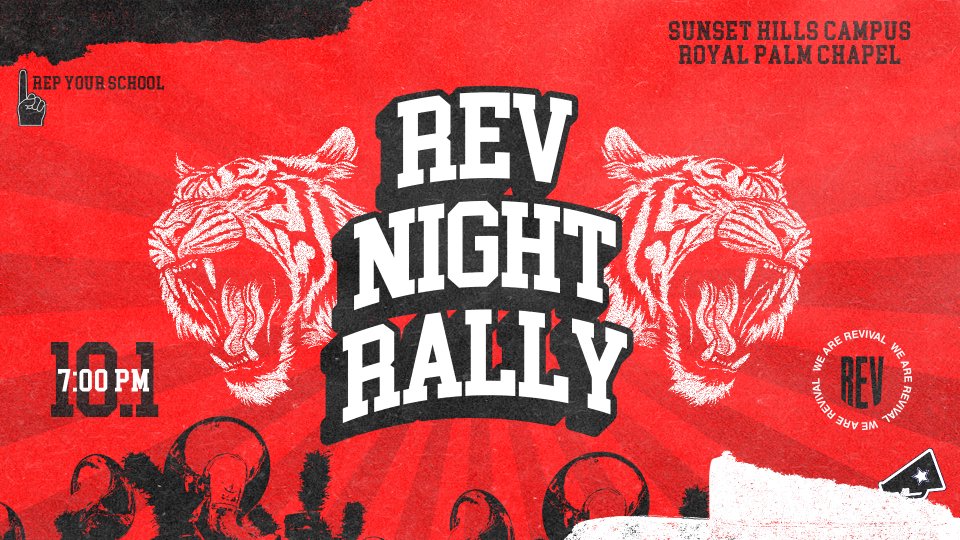 Bring the noise. Bring your colors. Bring your friends. REV Night: Rally is happening at the Earth City Campus and Royal Palm Chapel. It’s the ultimate night for students in grades 6th–12th with worship, a message that’s real for what they’re facing, plus dope pep rally competitions and food that brings the hype. Invite as many students as possible, and rep your school, because the team with the most is going to win big.