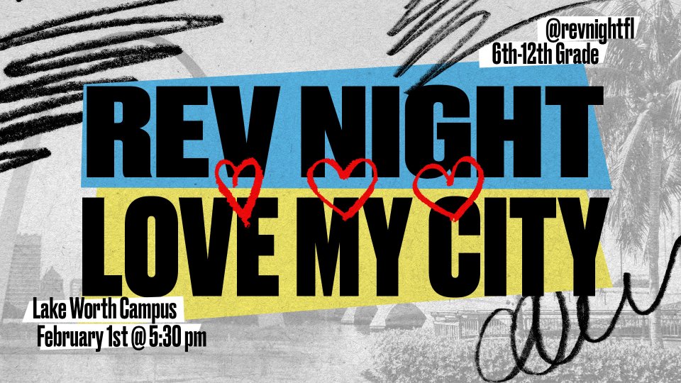 What if your student’s faith didn’t just stay personal, but became powerful in their community? REV Night: Love My City at the Lake Worth Campus is where students in grades 6th-12th will hear a message on serving and outreach, worship together, and walk away with practical ways to show the love of Christ in their community. Plus, we’ll have local food for snacks and plenty of time to connect with friends. It’ll be a fun night to discover how God can use them to impact their city.