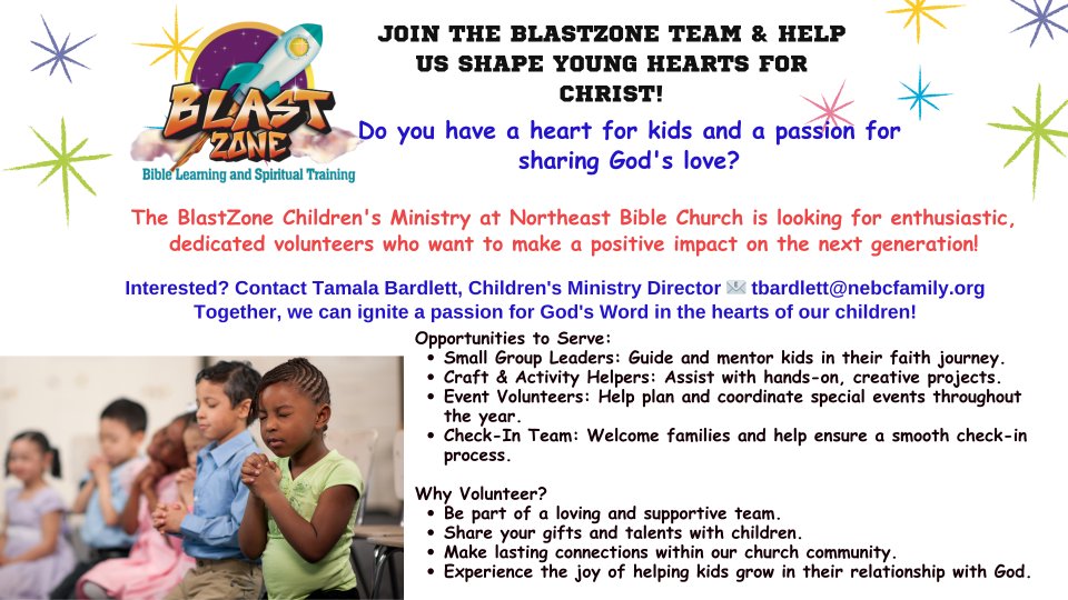 The BlastZone Children's Ministry at Northeast Bible Church is looking for enthusiastic, dedicated volunteers who want to make a positive impact on the next generation!