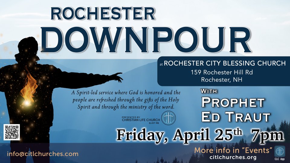 Join us for a special Downpour outreach service in Rochester on Friday, April 25th at 7 pm at the Rochester City Blessing Church at 159 Rochester Hill Rd. Rochester, NH 03867.