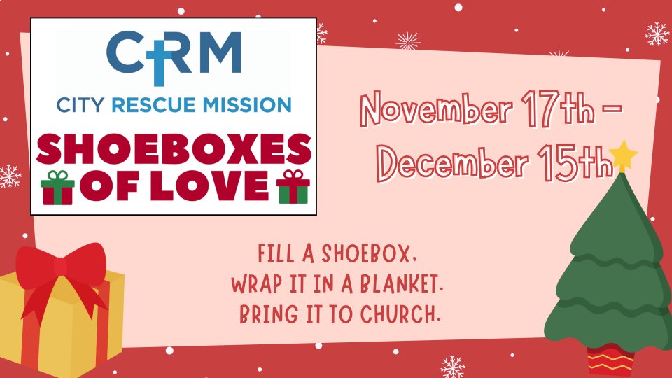 Return boxes to Christ church East by December 15th; we will deliver them all to Ciry Rescue Missions. Boxes can be dropped off at the mission's table in the lobby or the church office.