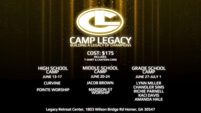 It is almost time for Youth camp at the Legacy retreat center! High school youth camp will be June 13-17th. Get your children signed up today for a life changing time at camp. Please see Craig and Mandy Sosebee.