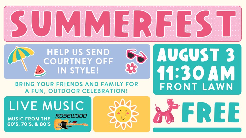 Join us for this summer celebration as we celebrate Courtney’s ministry and hear her final sermon at Ladue Chapel. After worship, enjoy live music by Craig Workman’s band, Rosewood, with snacks, a balloon artist, and water activities for the kids on the front lawn. We will have some chairs available, but feel free to bring your own chairs and blankets. Bring your friends and family to this exciting summer celebration!