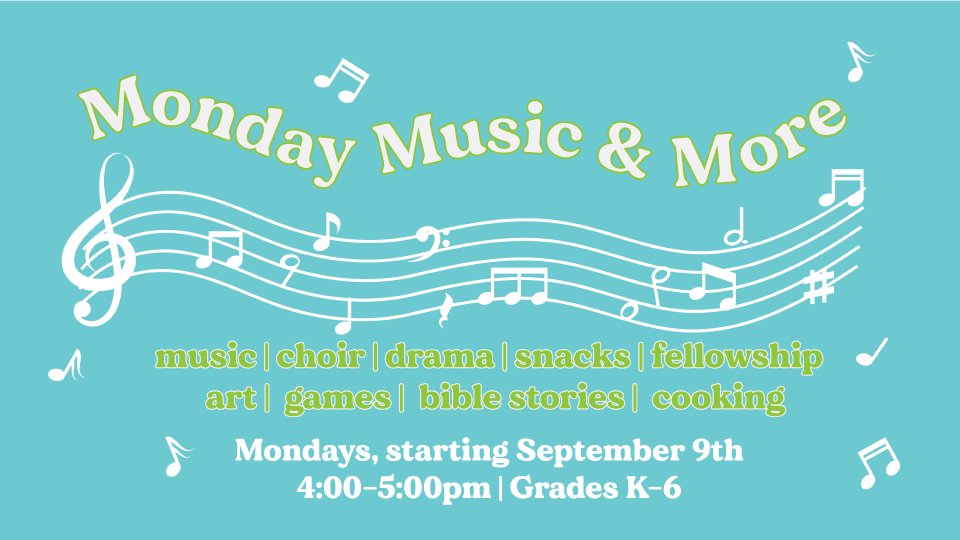 Music and More, our weekly choir/fellowship/activity program for children K-6. We meet each Monday from 4:00 until 5:00 PM for choir, snacks, recreation, and more! (The "more" might be a Bible story, drama, art project, cooking, or a surprise!) Meet us on the playground at 4:00 PM. No registration necessary