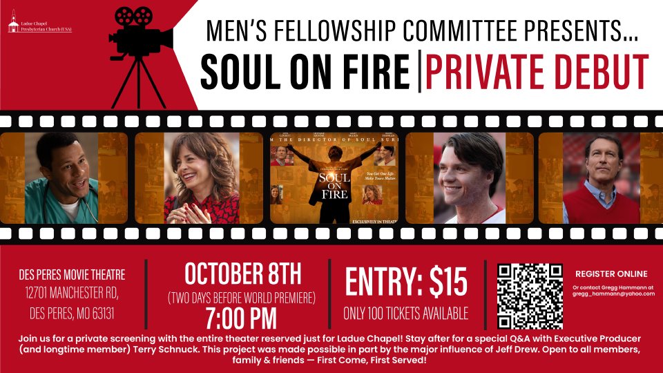 Soul on Fire is a movie that will have it's world premiere in on October 10th. Men's Fellowship will have a private showing of the movie on October 8th. (Two days before the world premiere) The executive producer of the movie is Terry Schnuck who is a long time member of Ladue Chapel. Terry has agreed to Q&A after the movie which should be very interesting. This project was made possible in part by the major influence pf Jeff Drew. This is an exclusive Ladue Chapel event with only 100 tickets available. The entire theatre will be reserved for us. Tickets are $15/person and is open to all Ladue Chapel members, family and friends. First Come....First Served!