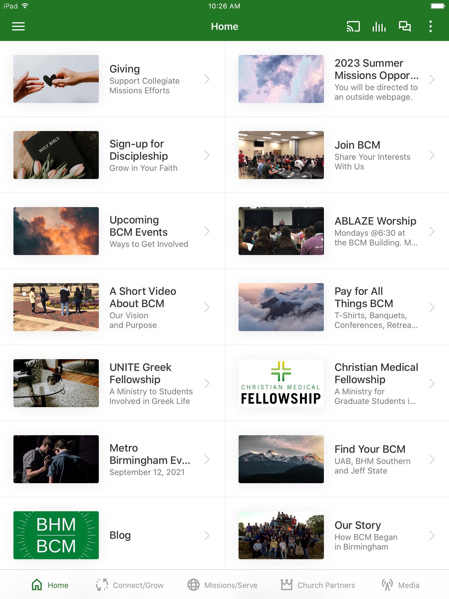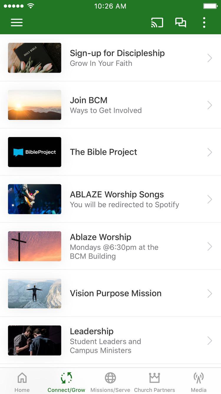 This app will help you stay connected with the day-to-day opportunities and events of the BCM ministries on Birmingham area universities and colleges. With this app you can: - Find details about BCM ABLAZE Worship - Find a LifeGroup (Small group discipleship) - Watch or listen to past messages - Find information on Mission Trips - Find Summer Mission opportunities - Stay up to date with push notifications - Share your favorite messages via Twitter, Facebook, or email - Download messages for offline listening - Donate to Missions