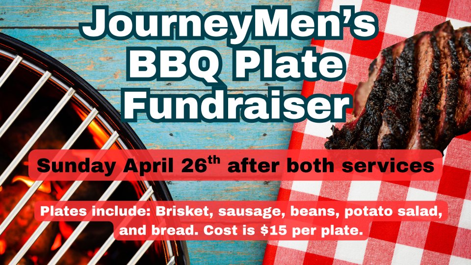 Sunday April 26th after both services Men's Ministry will be selling BBQ Plates which includes brisket, sausage, beans, potato salad, and bread! Plates are $15 and will go towards scholarships for the Men's Retreat.