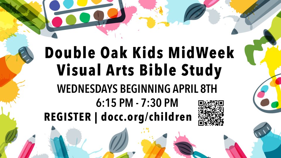 On April during MidWeek our Double Oak Kids (K-5th) can enjoy a Visual Arts Bible Study! We are so excited to let our Children explore their gifting and how they can use them to glorify the Lord. Please sign up below so that we can prepare our materials.