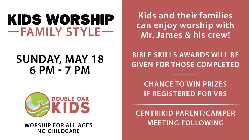 Sunday night, May 18, 6 pm - 7 pm is KIDS WORSHIP—FAMILY STYLE with James Spann and his crew! The night will feature music, Bible Story with a live artist, and a couple of surprises! This is a worship service for the ENTIRE FAMILY (no childcare available).