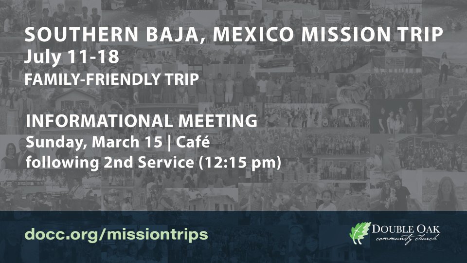 Join us Sunday, March 15 following the second service in the Cafe for an informational meeting about a new, family-friendly Mission Trip opportunity to Southern Baja, Mexico with Reel Life International. The trip will be this July 11-18. Make plans to join us for the meeting for more details.