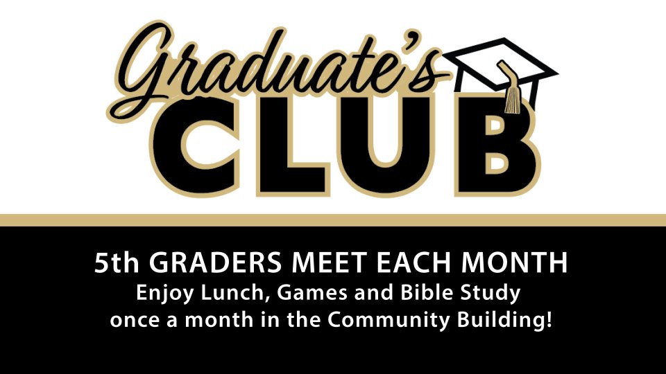 5th Graders—Join us for Graduate's Club following the 2nd service, 12:15 pm-2 pm and enjoy lunch, games, and Bible study once a month in the Community Building! We will meet various Sundays, September-May (Sept. 28; Nov. 9; Dec. 7; Jan. 4; Feb. 1; March 1; April 12; May 3). Enjoy pizza and treats plus games and fun. We want it to feel like an exciting privilege to be a part of this, a perk for being the oldest in the Kid’s Ministry. More importantly, we are also going to spend about 45 minutes digging into some of the most important themes of Scripture. We will explore The Bible Project with engaging videos that explain books of the Bible, important Bible words, and biblical themes in plain terms. We will use those videos to build lessons that will help expand your child’s understanding of how the whole Bible works together. Specifically, we will be watching their videos on the Law, the Image of God, Holiness, Sacrifice and Atonement, Messiah, the Gospel of the Kingdom, and the Day of the Lord. We will watch one video a week and walk slowly through what it teaches. This is a partnership between the Middle School Ministry and the Children's Ministry. Sandy and Sydney will both be teaching and hanging out with the kids. The goal is to transition the kids smoothly from Children's Ministry to Middle School Ministry. For more information contact Sandy Stephenson!