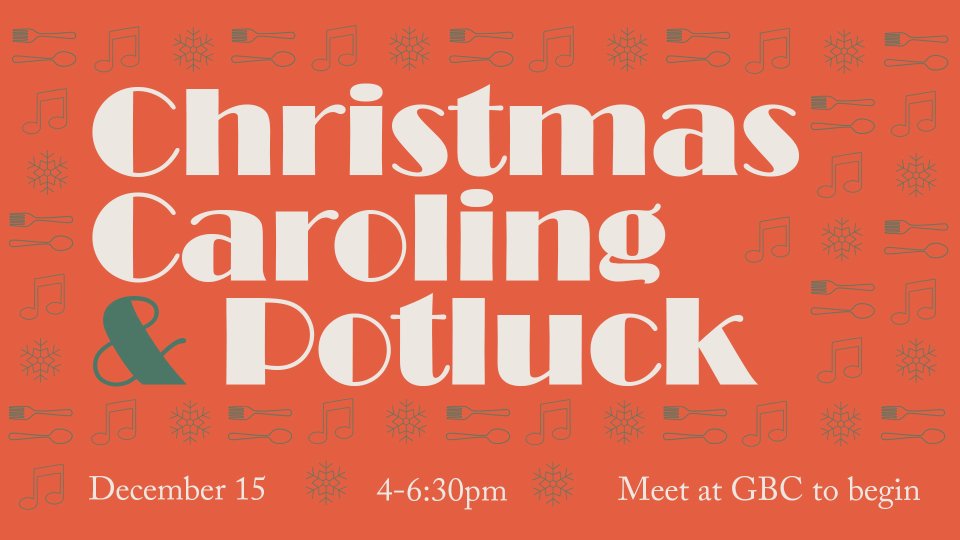 Join us for an evening of Christmas caroling! We’ll meet in the Worship Center at 4 pm to gather in groups and then make our way through different parts of town to sing Christmas carols for our neighbors. We’ll then meet back at church for a potluck dinner together. Click the link below to sign up for the potluck.