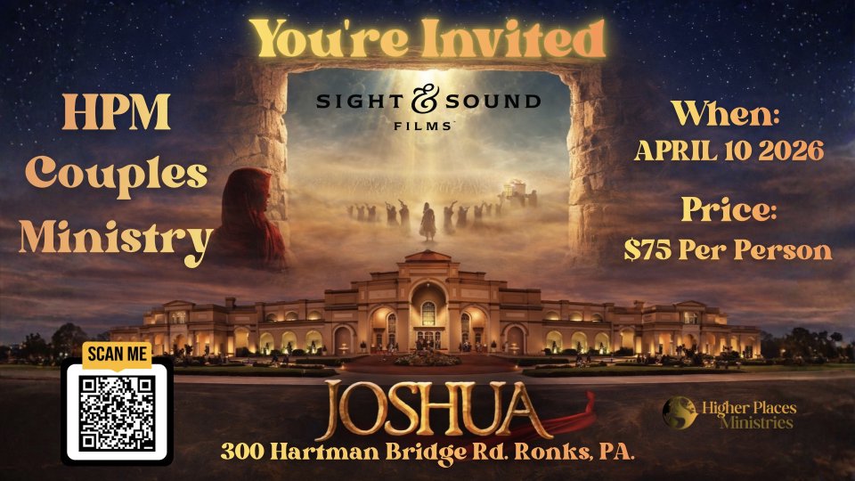 This is a Night for Couples to enjoy a night away, with God still at the center. We will be watching the play "Joshua". Cost will be $75.00 per Person which covers your Ticket into the Theatre. Seats are Limited and are Non-Refundable. Last day to register is 3/10/2026 payment due at time of Registering.