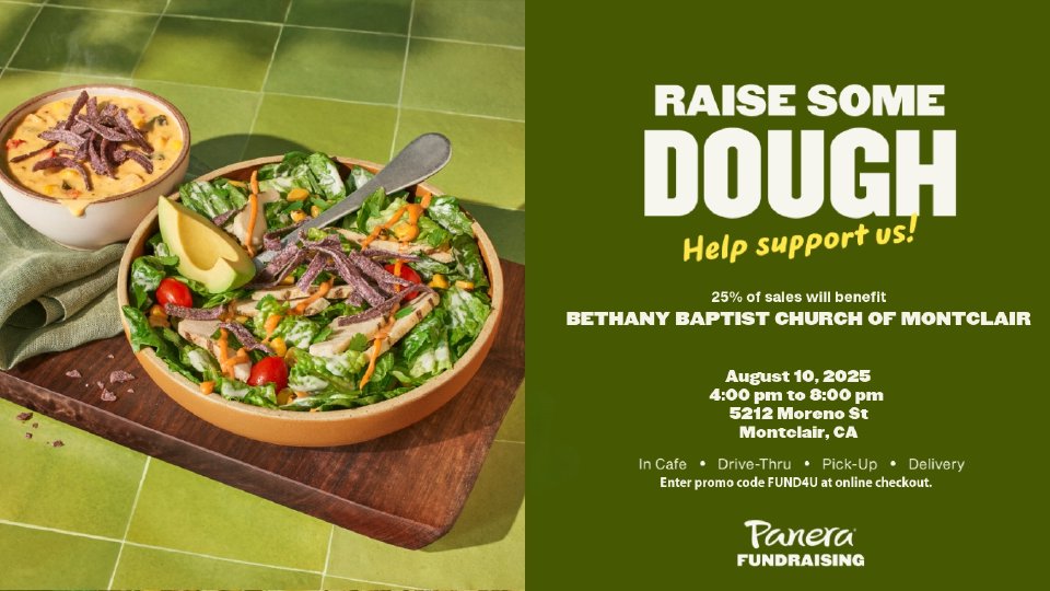 We had so much fun at our last Panera Bread night, we thought we would do it again. Join us during the hours of 4 - 8 pm. Enjoy a meal with our Bethany family. Schedule a time to meet with others. Panera Bread is located on Moreno St. in the Target shopping center. Remember to grab a flyer at church!