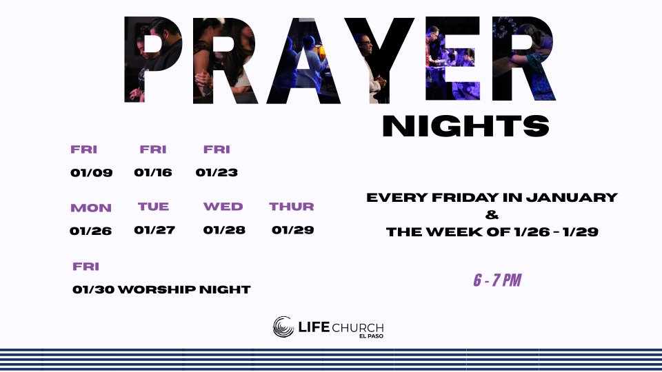 Come join us for a time of prayer from 6-7 pm dates: 1/9, 1/16, 1/23, 1/26, 1/27, 1/28, 1/29, 1/30. Every Friday in January and the week of 1/26 - 1/29.