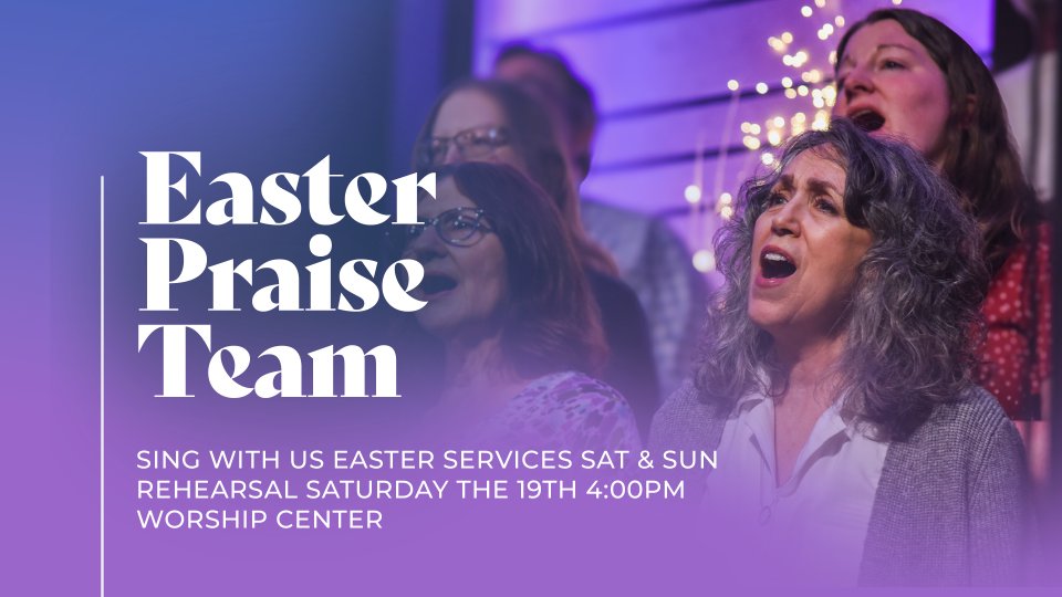 The Praise Team is helping lead worship for Easter! No audition necessary, just come to rehearsal Saturday April 19 at 4pm in the worship center! Singing at all services Saturday 6 pm, Sunday 8, 930 11, 1230. Contact Jana jandrus@wearescc.org