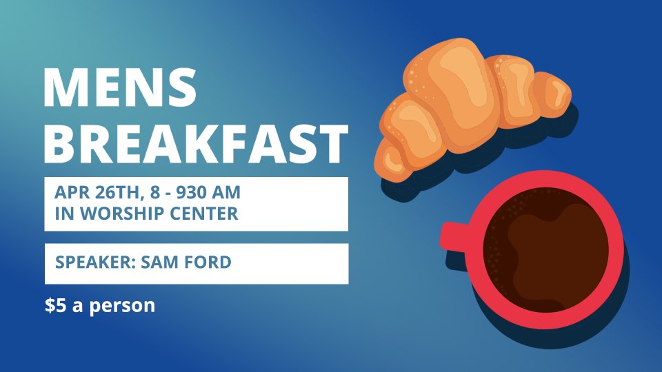 Join us Apr 26th 8 - 9:30 am for our Men's Breakfast! Sam Ford will be our speaker. Only $5.
