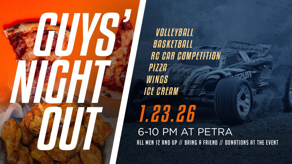 All guys ages 12+ looking for some fun and community this winter; this one’s for you! Guys' Night Out is Friday, January 23, from 6:00 to 10:00 P.M. Come out for a night of wings, pizza, games, prizes, and an RC Car Competition! Register for the competition below. Bring a friend, we'll see you there!
