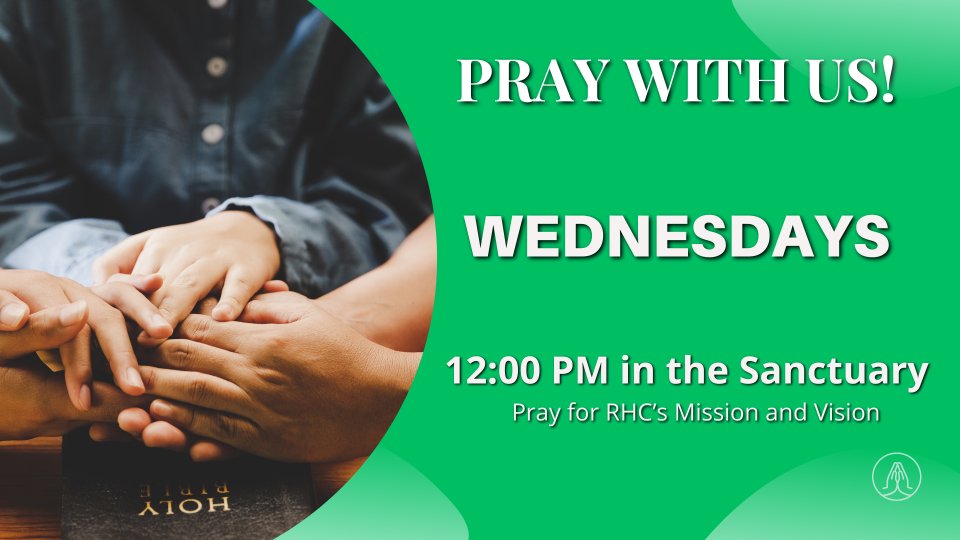 Come and join us in praying for RHC's Mission and Vision. We meet each Wednesday at noon. Take your lunch break and pray with us! We will meet in the Sanctuary.