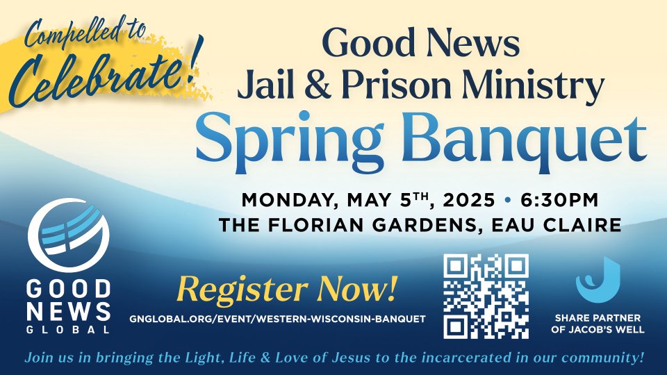 You're invited to the Good News Global 2025 Spring Banquet, an evening dedicated to bringing hope, healing, and restoration to incarcerated individuals in Western Wisconsin. As a Share Partner of Jacob’s Well, Good News Global (formerly Good News Jail & Prison Ministry) is committed to sharing the love of Christ with inmates in Eau Claire, Chippewa, Pepin, Buffalo, and Trempealeau County jails, as well as the NW Wisconsin Juvenile Detention Center.