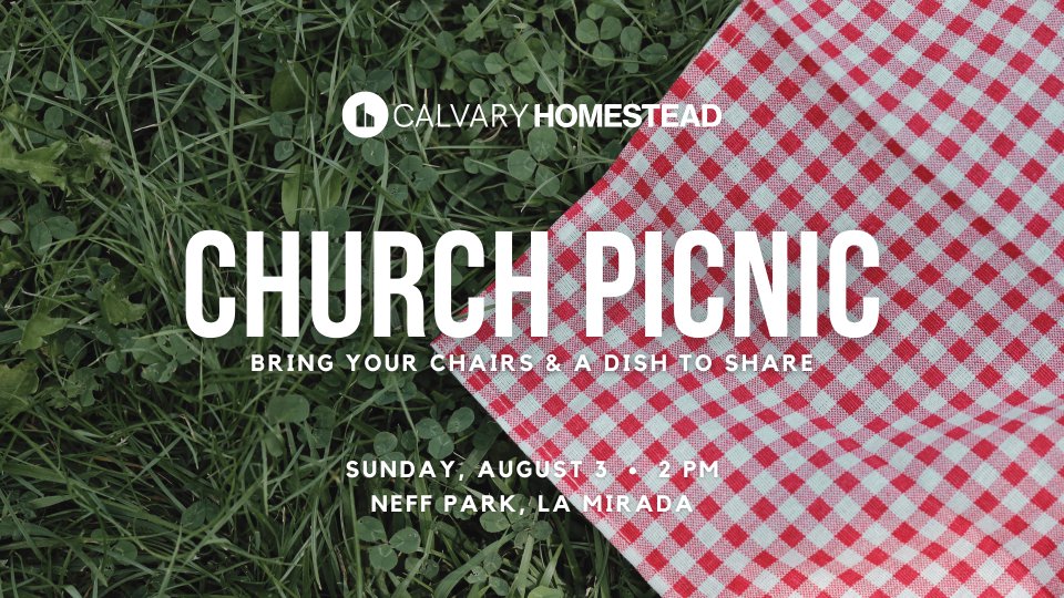 Bring your family, your chairs and a dish to share and come fellowship with us at our annual Church Picnic on Sunday, August 3 at 2:00pm. Join us for an afternoon filled with fellowship, games and a potluck at Neff Park in La Mirada.
