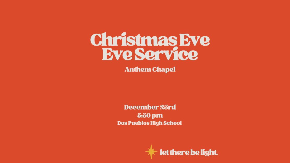 Join us for Anthem Chapels longest standing tradition: our Christmas Eve Eve service. We will meet at Dos Pueblos theater at 5:30pm. We are excited to celebrate Christmas through worship and a Christmas message from Pastor Nate. Afterwards we will have dessert out on the patio. Invite your friends and family to join us on this special evening!