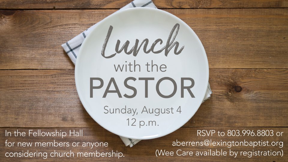 Our next Lunch with the Pastor is coming up on August 4 at 12pm! If you are a new member or are considering joining our church, this is a great way to learn more about LBC and meet our staff members! And did we mention there's free lunch? RSVP by emailing aberrens@lexingtonbaptist.org or register by clicking the link below! Wee Care is available by registration.
