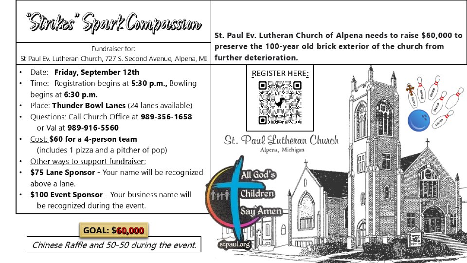 The “Strikes Spark Compassion” Event has been rescheduled for Friday, September 12th, 2025. Mark your calendar and plan now to join us at the Thunder Bowl Lanes! Please come out to bowl ($60) a team, be a lane sponsor ($75) or an event sponsor ($100). With the bowling you get a pizza and a pitcher of pop. Chinese Raffle and 50-50 during the event.