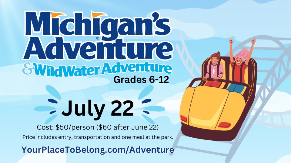 All Student Ministry is invited to join us on July 22nd, 2025 for a trip to Michigan Adventure! Cost of the trip is $50 per ticket and includes one meal at the park. Registration after June 23rd increases to $60 per ticket so make sure to get yours before then! We will be leaving at 9am and will be back by 11pm at the latest.