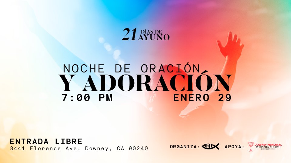 Queremos invitarte este proximo Lunes 29 de Enero a que nos encontremos en la ciudad de Downey para adorar juntos a nuestro Dios y también tener un tiempo especial de oración por las necesidades de nuestra comunidad. Lugar: 8441 Florence Ave, Downey, CA 90240 Hora: 7 pm Entrada Libre. Te esperamos.