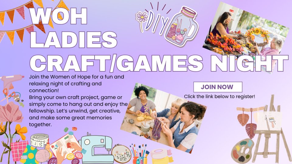 Get ready for a night full of creativity, laughter, games and connection at our upcoming Ladies Night at HCC, happening June 27th! We’ll kick things off at 7:00 PM and craft the night away. Bring your crafts, snacks, and plan to get comfy while crafting. Whether you're a seasoned DIY pro or just love to get creative, this is the perfect time to unwind, make something beautiful, and enjoy time with an amazing group of women. Don’t miss it!