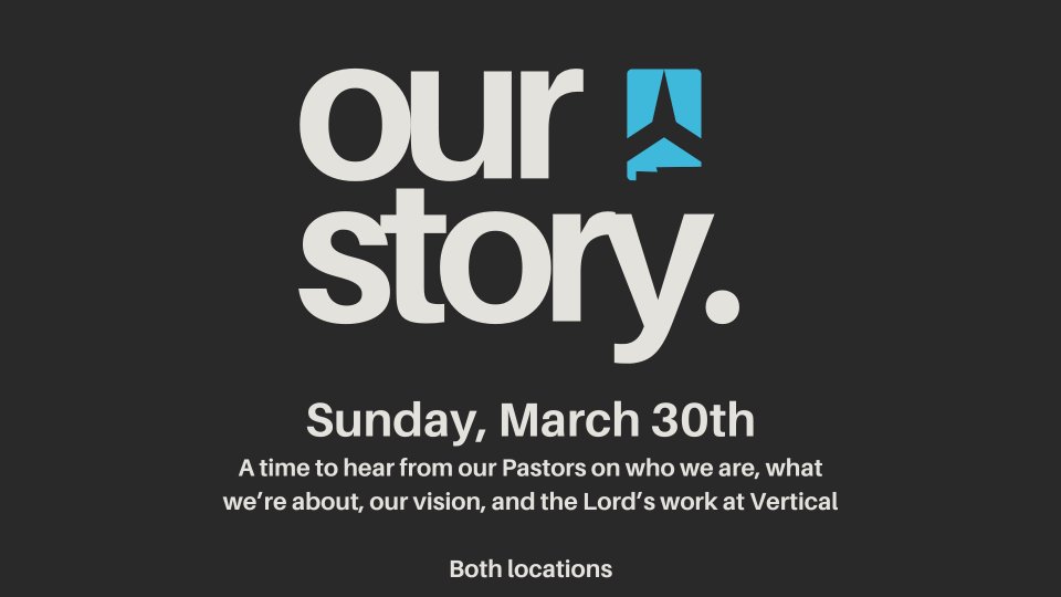 On Sunday, March 30th, we will be having Our Story! This is an informal time with our pastors to hear about who we are, how we got here and where we're going at Vertical.