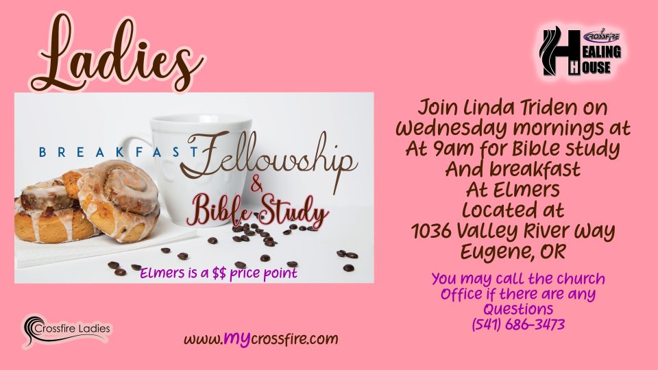Join Linda Triden on Wednesday mornings at 9am for bible Study and breakfast at Elmers. Located at 1036 Valley River Way, Eugene, OR