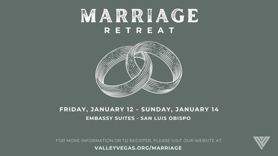 Married couples, join us for a weekend away at the Embassy Suites in San Luis Obispo, California, January 12 - 14, 2024. The cost is $499 per couple and includes a two-night hotel suite, parking/resort fees, a made-to-order breakfast each morning, and an amazing conference, which is being completely revamped, where each session will strengthen and replenish your marriage to help take it to the next level. The registration deadline is Wednesday, Dec. 13, or until spaces are filled. To register online, please visit valleyvegas.org/marriage