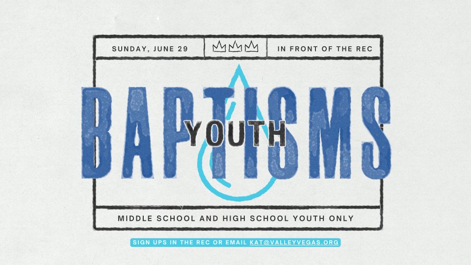 Youth Baptisms will be held on Sunday, June 29 after the 12pm service in front of the REC. We would like to invite Middle School and High School Youth who are ready to take the next step in their faith. The current teachings in the Youth services are on Baptism & Salvation for students to gain more understanding of what it means to be saved and baptized.