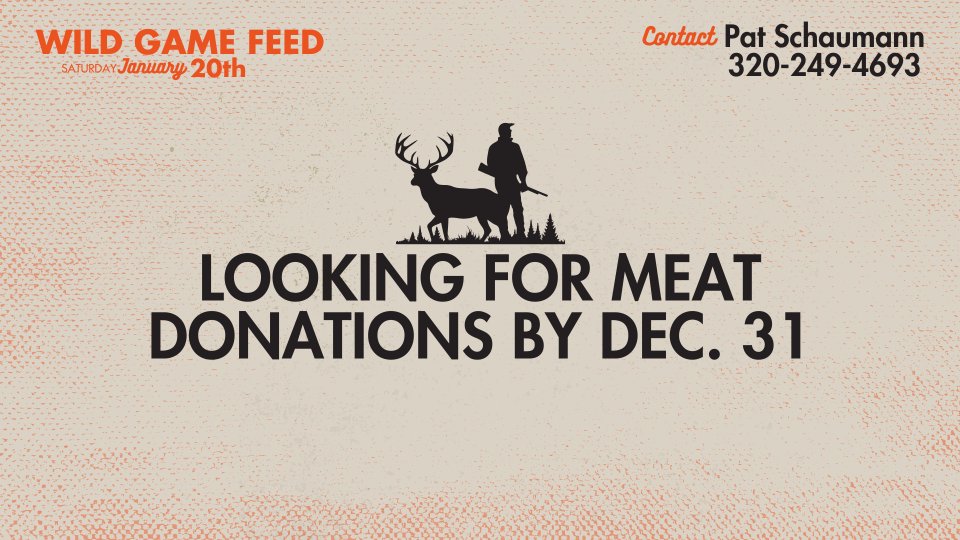 Wild Game Feed FEAT Matt McPherson is taking place Saturday, January 20 - it is going to be an amazing event you don’t want to miss! We are currently looking for meat donations of any kind - anything from trimmings to a full deer. ALL DONATIONS NEED TO BE MADE BY December 31. ^Meat can be delivered to the freezer in the new kitchen at church Email Pat Schaumann OR call Pat at (320) 249-4693 with any questions regarding meat donations for Wild Game Feed.