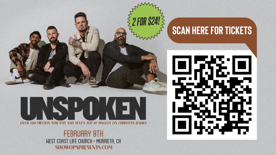 Come enjoy an incredible evening of worship with Unspoken as they visit Murrieta! Featuring hits like "Start A Fire" and "Reason," you won't want to miss out on this extraordinary night of music and praise. We hope to see you there!