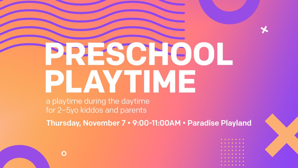 All preschoolers from the age of 2 to 5 and their parents!) are invited to join us at Paradise Playland from 9:00-11:00AM on Thursday, November 7.