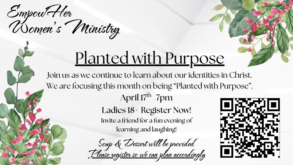 Ladies 17+ - come join us as we learn about being planted in Christ with purpose. There will be a light meal of soup and dessert provided. We will also have some fun activities and group time. Please register in advance so we can plan accordingly.