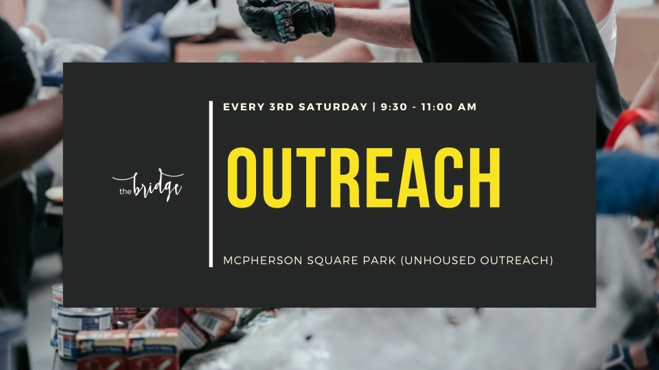 Join the Outreach service team on the 3rd Saturday of every month from 9:30 AM to 11:00 AM at McPherson Square (901 15th St. NW, Washington, DC 20005) to bring hope, encouragement, and prayer to the unhoused community. This is a meaningful opportunity for the entire congregation to make a difference. We’d love to see you there!
