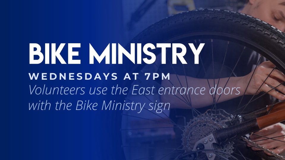 This is a ministry that is involved in outreach by fixing bicycles and giving them new owners. Volunteers use the East entrance doors with the Bike Ministry sign.