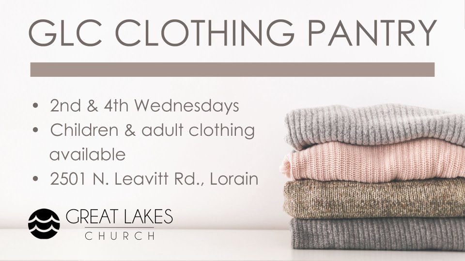 Our GLC Clothing Pantry is open every 2nd and 4th Wednesday of the month from 9am - 11:30am. Both children and adult clothing are available.