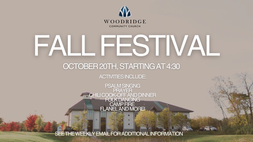On October 20th, we will be having a fall festival at Woodridge. This will be during the normal monthly rhythm of the Feast and Fellowship night and will include Psalm singing, prayer, and a chili cook off! After supper, there will be opportunities for fellowship, group folk dancing and enjoying our church property with a fire (weather permitting). Bring your campfire chairs, flannel jacket or shirts and your dancing shoes with you for a fun, fall fellowship time together (dancing is optional of course but recommended if you want to smile😊).