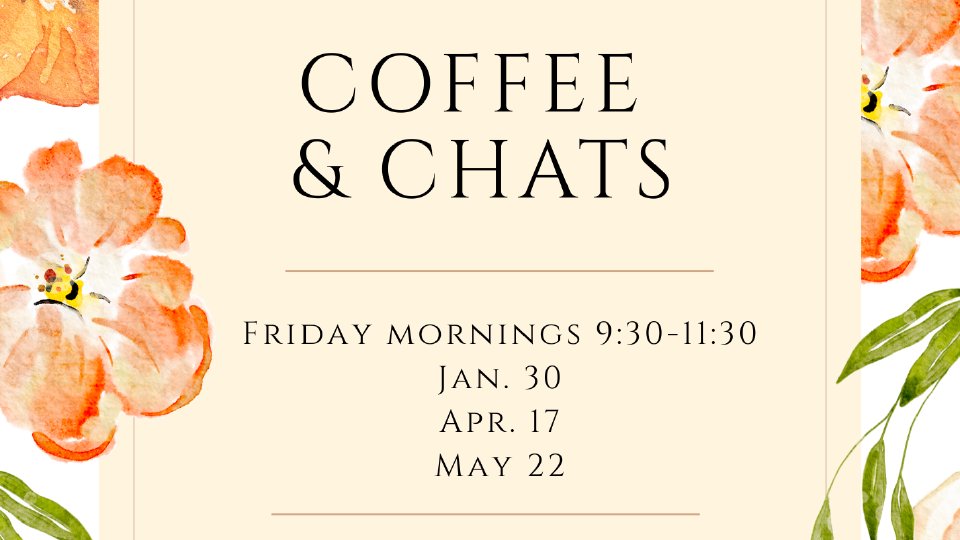 Moms of Littles, join other moms for coffee and conversation at the Schaeffer House coffeeshop between 9:30-11:30 on the following Friday mornings: Jan. 30, Apr. 17, May 22. Kids are welcome!