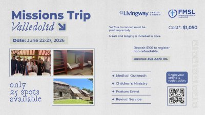 Join us as we step out in faith and serve together on our 2026 Mission Trip to Mexico! From June 22–27, Livingway Family Church will partner with local ministries to share God’s love through hands-on service, community outreach, and meaningful relationships. This trip is open to everyone in our congregation! Whether you’ve been on a mission trip before or this is your first time, this is a powerful opportunity to grow in faith, experience new cultures, and make a lasting impact for the Kingdom of God. We’ll spend the week working alongside local believers, supporting outreach projects, and sharing the hope of Christ in both word and action. Together, we’ll learn, serve, and see how God moves when His people unite with open hearts.