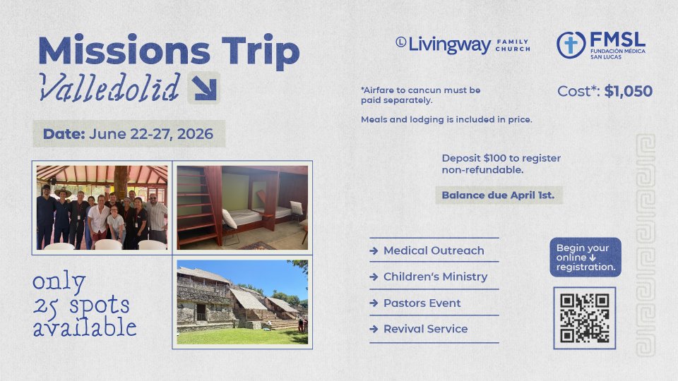 Join us as we step out in faith and serve together on our 2026 Mission Trip to Mexico! From June 22–27, Livingway Family Church will partner with local ministries to share God’s love through hands-on service, community outreach, and meaningful relationships.