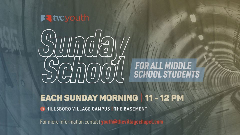 TVC Youth Sunday School will be meeting each Sunday morning from 11- 12 pm for all middle school students in the Basement of the TVC Hillsboro Village Campus. For more information contact youth@thevillagechapel.com