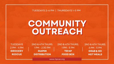 Whether you are looking for some assistance or like to help us serve our community better, be part of our weekly Community Outreach. Grocery Rescue – Tuesdays (2 PM - 4 PM) Diaper Distribution – 2nd & 4th Thursdays (1 PM - 2:30 PM) TEFAP Food Box – 2nd & 4th Thursdays (1 PM - 5 PM) Grab & Go Hot Meals – 2nd & 4th Thursdays (3 PM - 5 PM) Location: 4108 E North St, Tucson, AZ 85712 (Fellowship Hall)